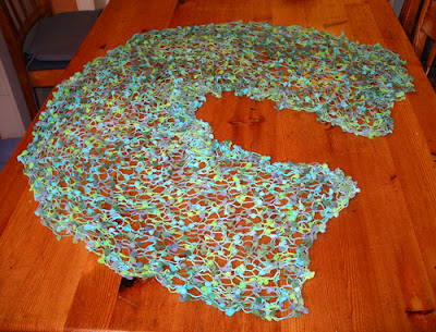Atkal jau draudzenei. Rets ciemiņš ko gaidām jau rīt no Vācijas. Gribējās kaut ko jauku dāvināt. Un arī šai šallei pēdējais lielais iepirkums lieti noderēja. Adīju ar 15mm adatām.