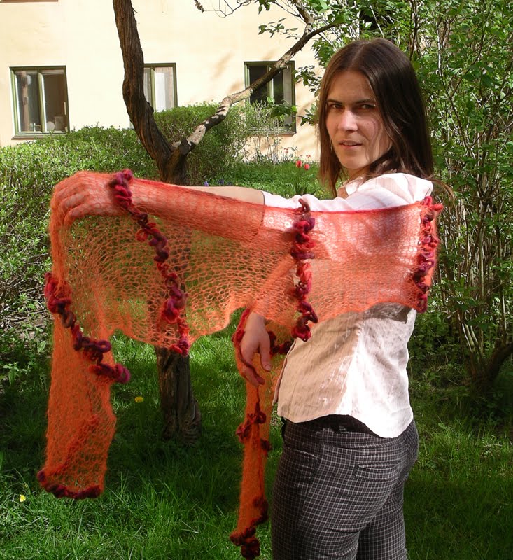 Atklāti sakot pati nekad nebūtu aizdomājusies savienot vienā projektā divas tik ļoti dažādas dzijas. Bet kāds cits to izdarīja šeit knitty un es to izmantoju. Šallīte ir tapusi gandrīz 3 gadus atpakaļ (tas ja rodas jautājumi par manu figūru un frizūru). Dzija Kidopale no Fonty un Ocean no Idena. Adīts ar 12mm adatām.